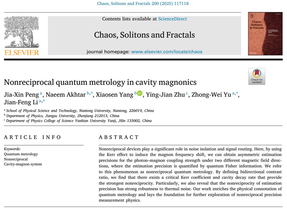 近日,物理科学与技术学院彭家鑫博士团队在非互易量子精密测量研究方面取得新进展,相关研究成果以“Nonreciprocal quantum metrology in cavity magnonics”(腔磁振子学中的非互易量子计量)为题发表在国际著名期刊Chaos, Solitons and Fractals上。南通大学为第一署名单位。