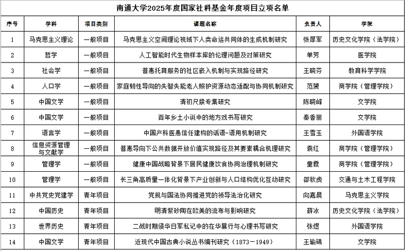 近日,2025年度国家社科基金年度项目立项结果公布。我校14项项目获批,其中一般项目10项,青年项目4项,在去年取得历史性突破的基础上,继续保持稳步发展态势,展现出我校在哲学社会科学研究领域的可持续发展能力。
