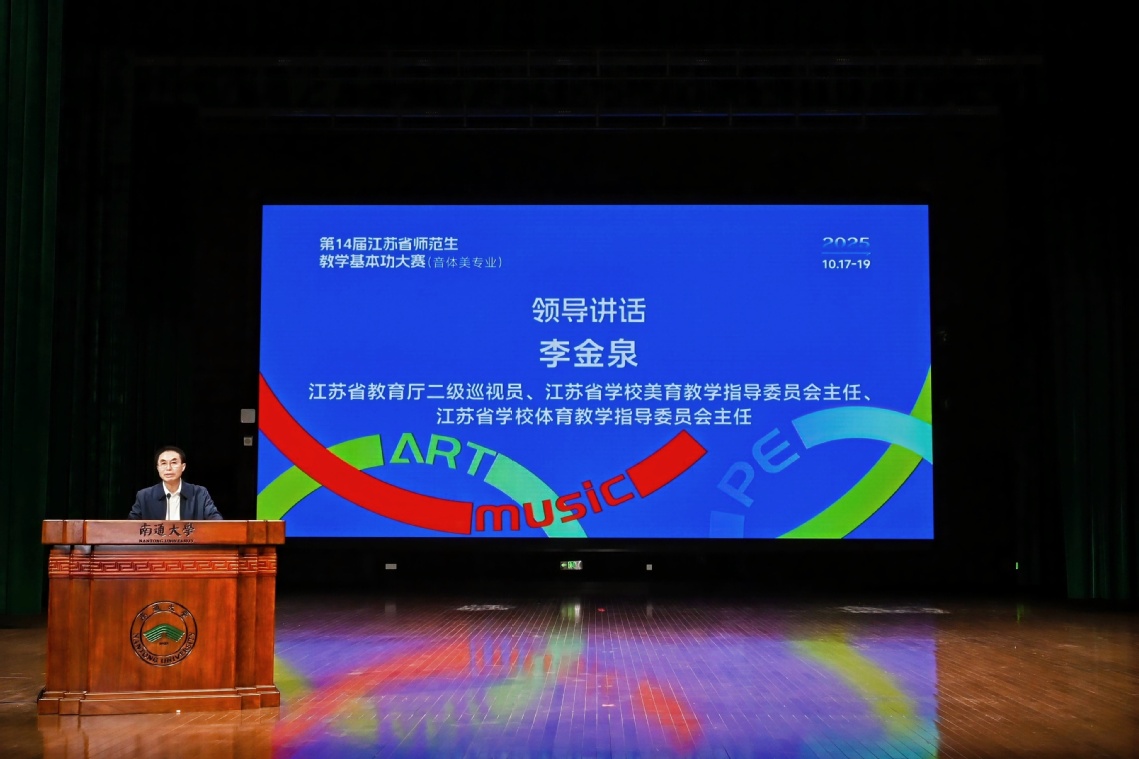 10月17—19日,第十四届江苏省师范生教学基本功大赛(音体美专业)在我校举办。江苏省教育厅二级巡视员、江苏省学校美育教学指导委员会主任、江苏省学校体育教学指导委员会主任李金泉在开幕式上讲话。校党委常委、副校长徐骏代表学校致辞。