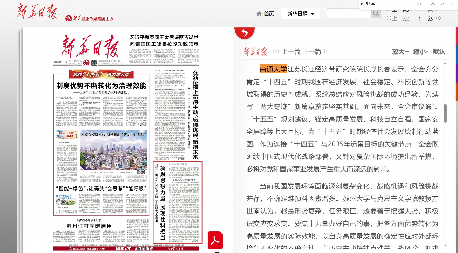 10月20日—23日,中国共产党第二十届中央委员会第四次全体会议在北京举行。10月27日,《新华日报》头版刊发题为《凝聚思想力量 展现社科担当 我省社科理论界认真学习党的二十届四中全会精神》的报道,聚焦我校专家认真学习领会党的二十届四中全会精神。此外,南通电视台也关注了我校师生第一时间学习感悟。