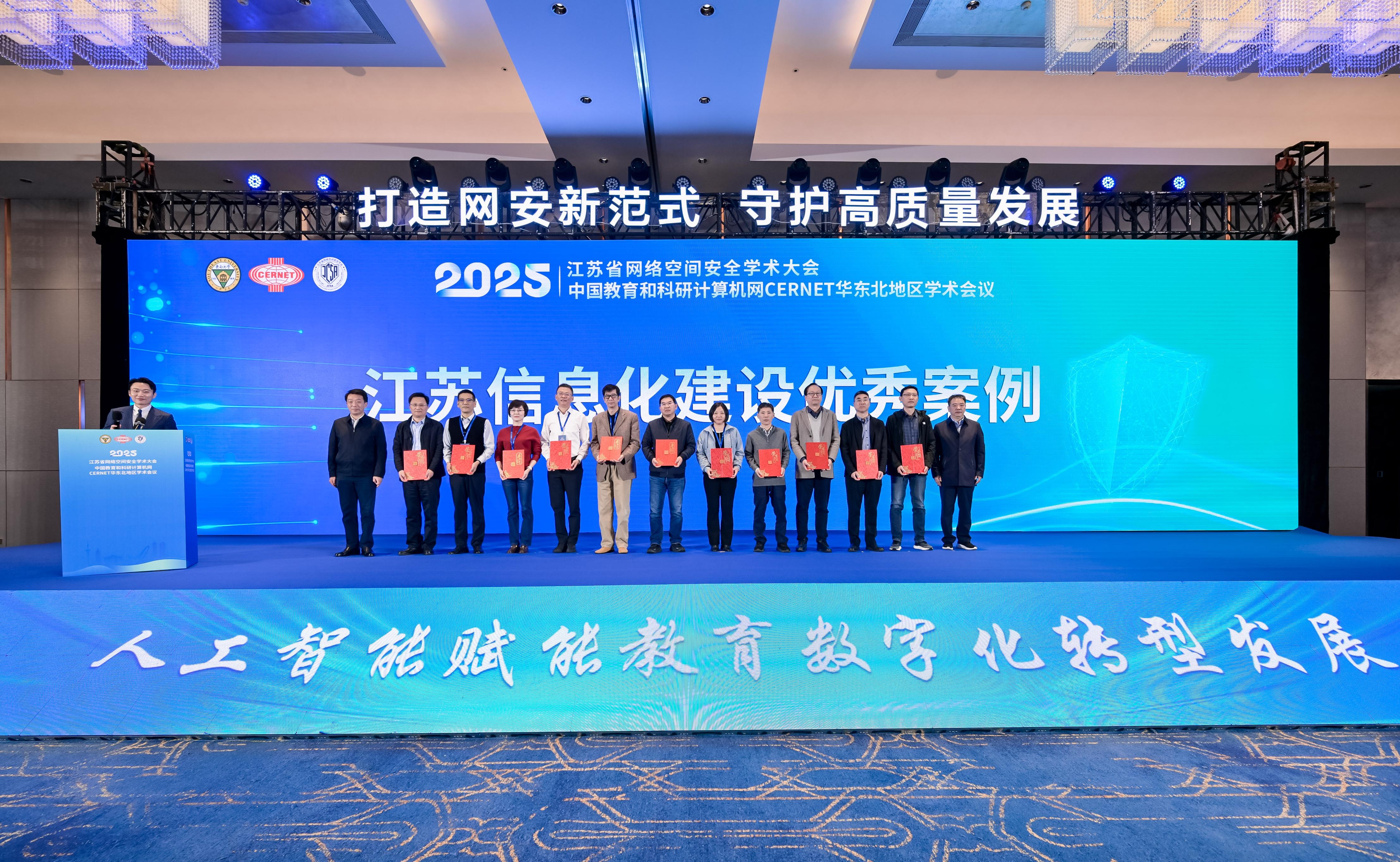11月6日,2025年中国教育和科研计算机网华东北地区学术会议在南京召开,会上公布了江苏省教育行业IPv6规模部署及教育数字化转型应用案例遴选结果。我校申报的案例《探索构建基于“双轮、三维、四域”模型的教育数字化转型生态》入选“信息化建设优秀案例”。
