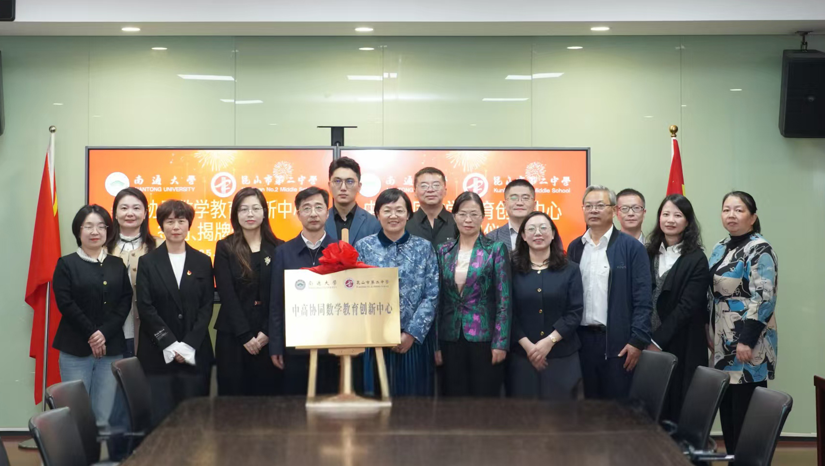 在昆山市第二中学,仲跻宏对我校到访表示欢迎,介绍了昆山教育的总体情况和昆山二中“轻负高效、教体融合”的办学特色,期待通过与我校合作共建,进一步提升教师专业能力发展与教学创新。陈玉娟介绍了我校在数学教育领域的学科优势与人才优势。她指出,未来两校将围绕“双师同行”“数学文化共建”“同辈成长计划”三大品牌开展深度合作,共同打造数学教育创新高地,实现“中高协同、共育英才”的目标。期间,仲跻宏与陈玉娟共同为两校共建的“中高协同数学教育创新中心”揭牌,昆山二中校长徐欣与我校数学与统计学院院长王林峰代表双方签署《南通大学教学实践基地共建协议书》。