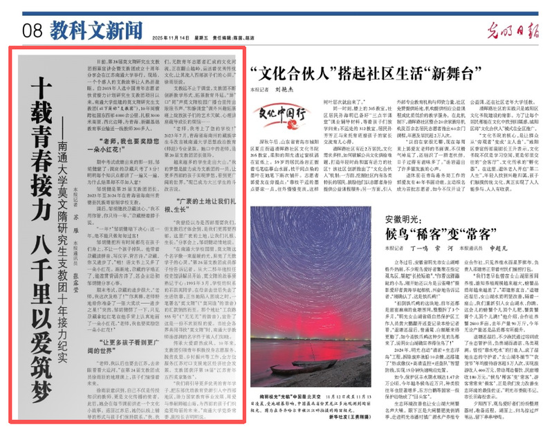11月14日,《光明日报》刊发题为《十载青春接力 八千里以爱筑梦——南通大学莫文隋研究生支教团十年接力纪实》的报道,关注我校莫文隋研究生支教团十年青春接力的支教故事。