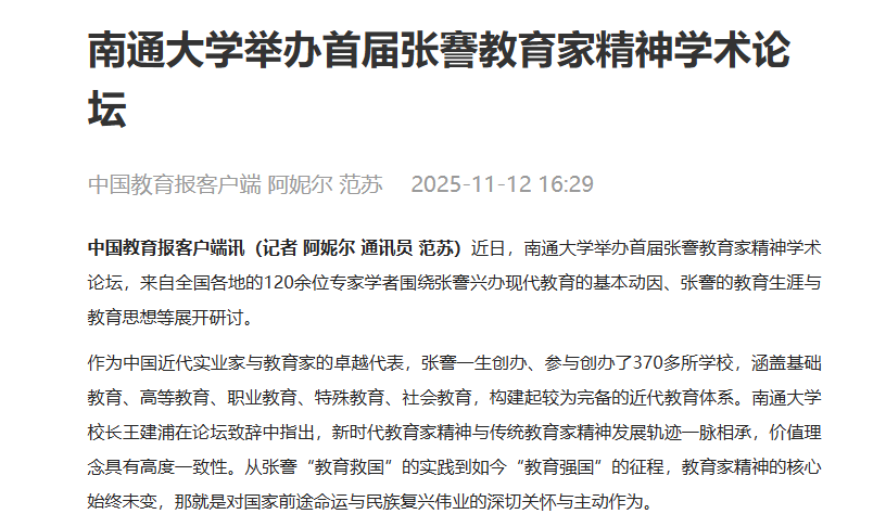 11月12日,中国教育报客户端发布题为《南通大学举办首届张謇教育家精神学术论坛》的报道,关注我校举办的该项学术活动。江苏教育报、南通电视台、南通发布等媒体也进行了报道。