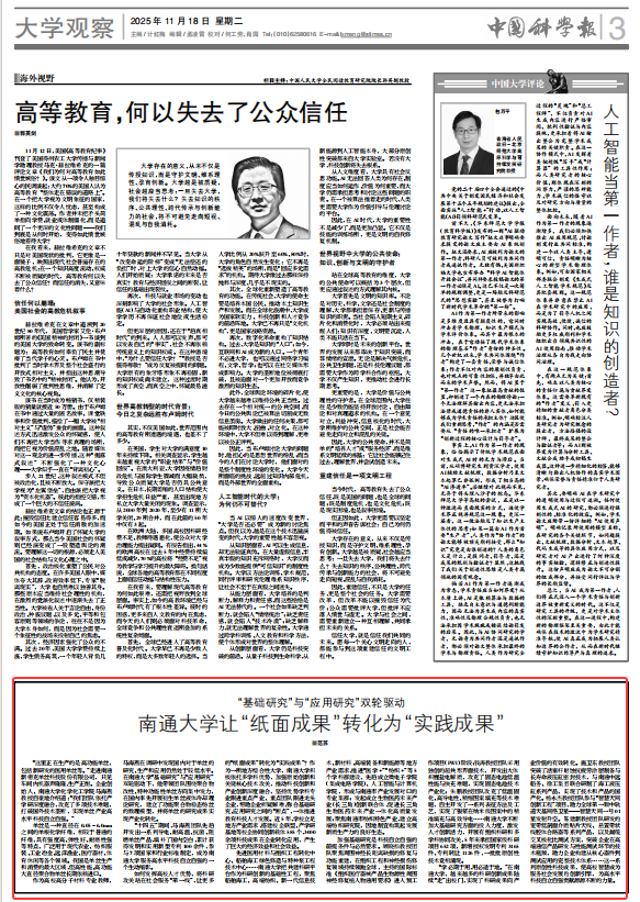 11月18日,《中国科学报》刊登题为《“基础研究”与“应用研究”双轮驱动 南通大学让“纸面成果”转化为“实践成果”》的报道,聚焦我校充分发挥人才优势,聚力科研攻关和科技成果转化的创新实践。