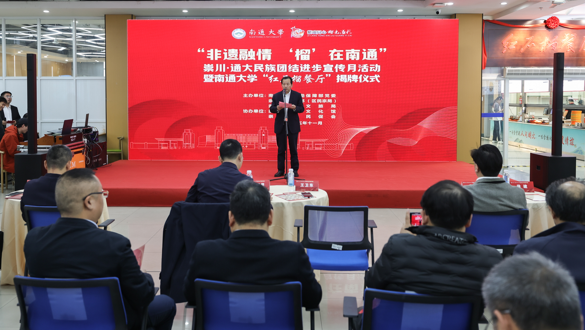 为进一步贯彻落实党的二十届四中全会精神、习近平总书记关于加强和改进民族工作的重要思想,11月24日下午,后勤保障部党委联合崇川区委统战部(区民宗局)、崇川区文旅局在啬园校区二食堂举行“非遗融情‘榴’在南通”崇川·通大民族团结进步宣传月活动暨南通大学“红石榴餐厅”揭牌仪式。校党委副书记王卫东,崇川区委常委、组织部部长、统战部部长张明星,校党委常委、统战部部长朱城等共同为“红石榴餐厅”揭牌。