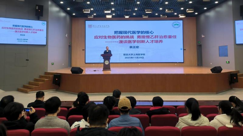 作为国家重大科学研究计划首席科学家,袁正宏长期深耕肝炎病毒基因复制与致病机理、机体天然免疫与病毒感染相互作用等研究领域,形成了具有国际前沿水平和学术特色的研究方向,为我国生命科学发展作出了重要贡献。他以《把握现代医学的核心应对生物医药的挑战勇担慢乙肝治愈重任—— 漫谈医学创新人才培养》为题,结合自身深厚的学术积淀与丰富的实践经验,围绕把握现代医学的核心、应对生物医药的挑战、勇担慢乙肝治愈重任三个方面内容展开深入阐述。他以通俗的语言解读专业前沿知识,重点分享了医学创新人才培养的核心要素与实践路径,为在场师生搭建了一座连接理论研究与临床应用、个人成长与行业发展的桥梁。整场报告内容丰富、见解深刻,既有对学术前沿的精准把握,更有对青年一代的殷切嘱托,让每一位与会者深受启发、倍感振奋。报告现场气氛热烈,现场师生踊跃提问,围绕医学科研思路、青年医生成长路径等问题展开深入交流。袁正宏耐心倾听每一个问题,结合国际前沿动态与自身研究经历逐一细致解答,鼓励青年师生既要扎根专业基础、精进学术能力,也要关注行业需求、勇于开拓创新,在医学领域实现个人价值与社会价值的统一。