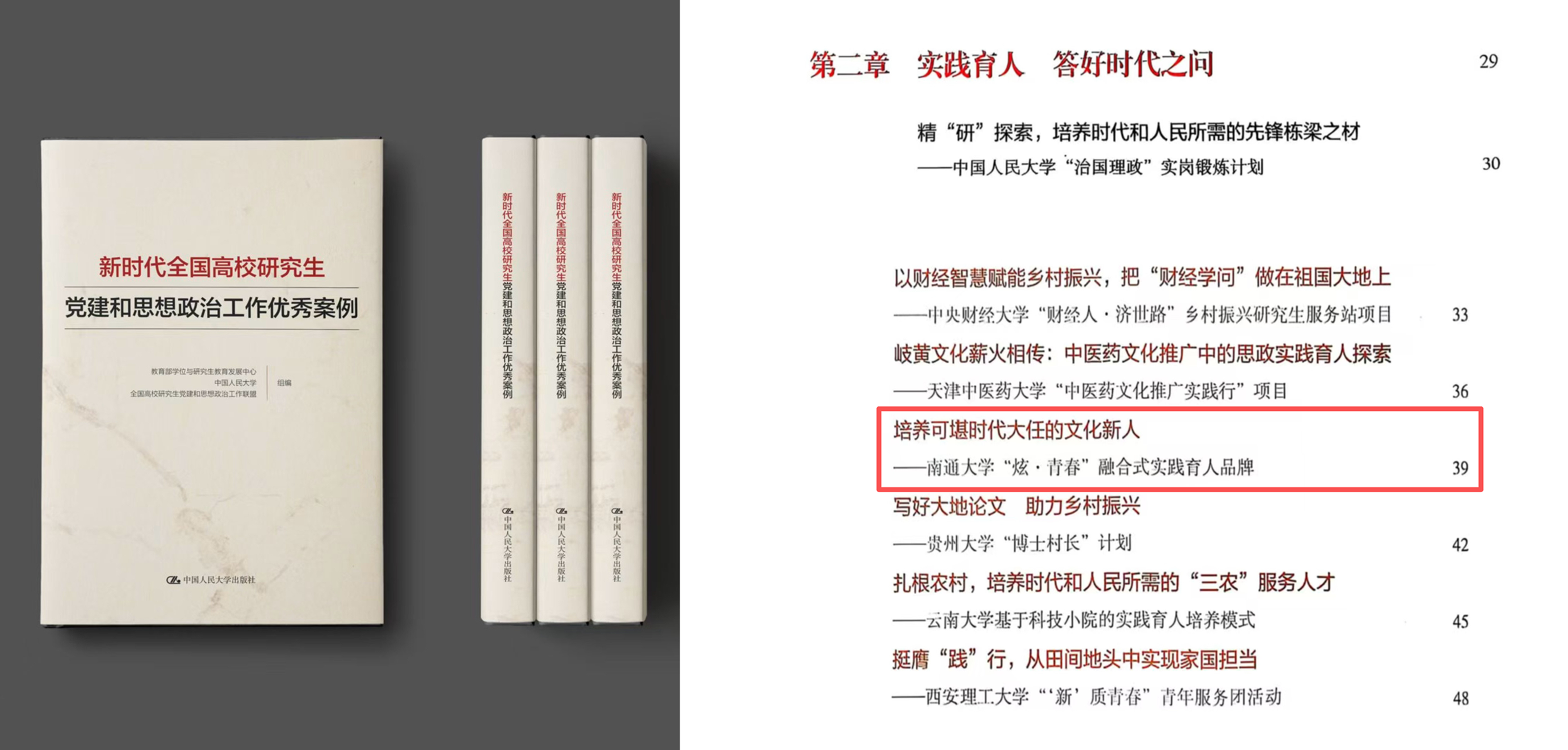 12月2日,新时代全国高校研究生党建和思想政治工作研讨会(2025)在中国人民大学举行,会上发布了由教育部学位与研究生教育发展中心指导,中国人民大学、全国高校研究生党建和思想政治工作联盟组编的《新时代全国高校研究生党建和思想政治工作优秀案例》,系统梳理并展示了各高校具有特色和亮点的实践探索与育人成果,旨在为全国高校落实立德树人根本任务提供有益借鉴和实操参考。我校报送的案例《培养可堪时代大任的文化新人——南通大学“炫·青春”融合式实践育人品牌》入选,成为全国42项优秀典型案例之一。