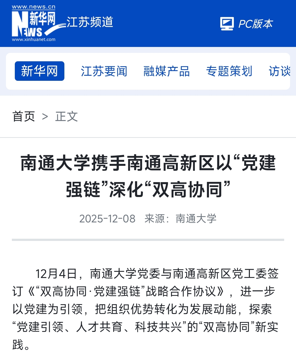 12月8日,新华网发布题为《南通大学携手南通高新区以“党建强链”深化“双高协同”》的报道,聚焦我校探索“党建引领、人才共育、科技共兴”的“双高协同”创新实践。交汇点新闻客户端、南通广播电视台、南通发布等媒体也进行了报道。
