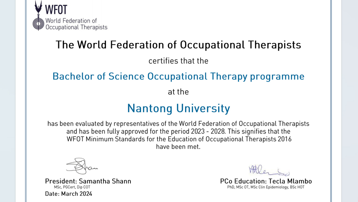 康复治疗学作业治疗教育项目通过WFOT认证