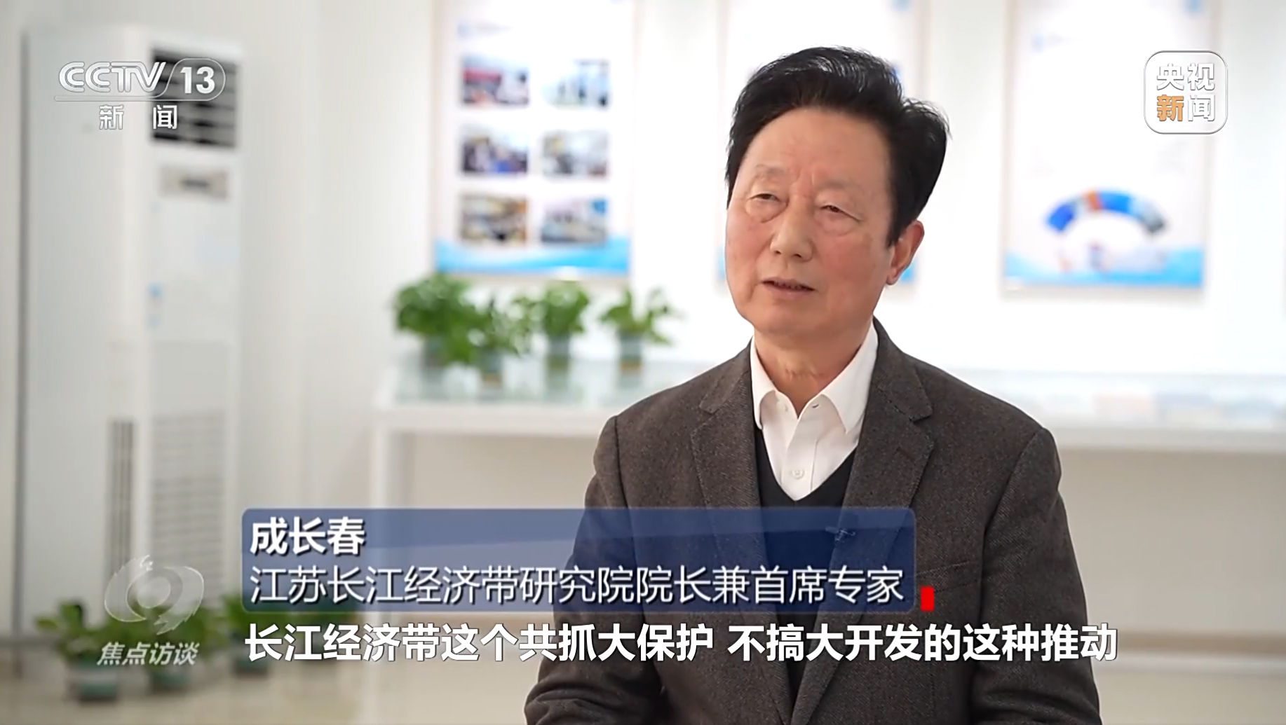 1月4日,中央电视台《焦点访谈》栏目播出《新时代长江之歌 十年守护 见证绿色蝶变》节目,就长江大保护工作采访我校理论研究基地学术委员会副主任、江苏长江经济带研究院院长兼首席专家成长春教授。成长春指出,生态优先强调生态保护的重要性,它的最终目的就是促进经济社会发展的全面绿色转型。他表示,长江经济带“共抓大保护、不搞大开发”的推动,不仅仅给我们沿江的城市带来了生态效益,更重要的是从经济社会的全面绿色转型入手,推动了整个经济社会的全面发展。