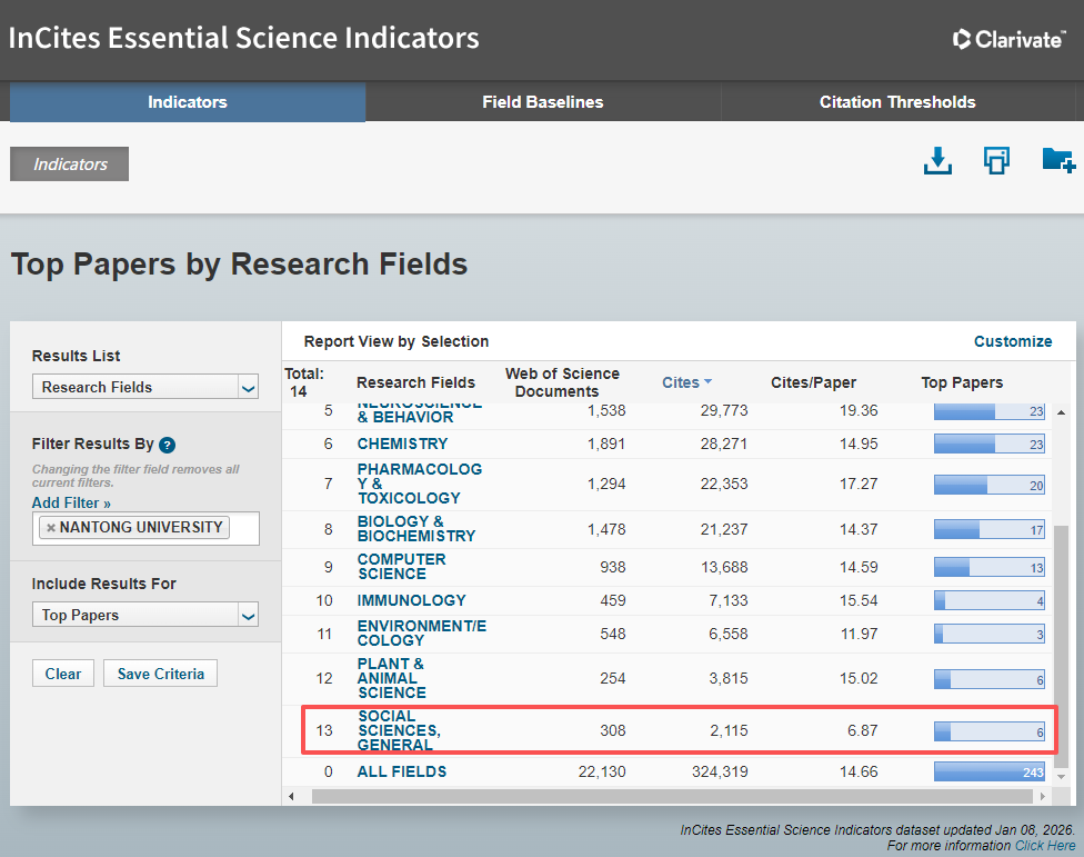1月8日,国际性第三方评价机构科睿唯安发布了2026年1月期ESI数据。我校社会科学学科进入ESI全球排名前1%学科行列,实现了学校在人文社科领域学科零的突破。至此,我校ESI全球前1%学科总数增至13个,学校国际学术影响力与核心竞争力持续提升。