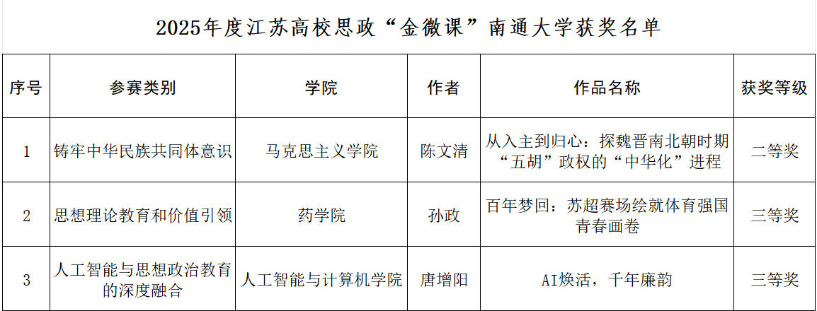 本次活动旨在深入实施“新时代立德树人工程”,不断提升高校网络育人能力。活动共征集参评作品530项,经材料初筛、资格审核、专家函评、作品政审和终审会评,共遴选出获奖作品108项,其中一等奖16项、二等奖33项、三等奖59项。我校获奖作品紧扣网络传播特点,以“微课”为载体,将思政主题转化为青年喜闻乐见的“指尖内容”,既发挥了不同学科的专业优势,又打通了思政教育“线上线下”的融合渠道,为增强网络思政的吸引力、感染力与实效性提供了鲜活范例。其中,马克思主义学院教师陈文清的作品《从入主到归心:探魏晋南北朝时期“五胡”政权的“中华化”进程》获铸牢中华民族共同体意识类二等奖,药学院教师孙政的作品《百年梦回:苏超赛场绘就体育强国青春画卷》获思想理论教育和价值引领类三等奖,人工智能与计算机学院教师唐增阳的作品《AI焕活,千年廉韵》获人工智能与思想政治教育的深度融合类三等奖。