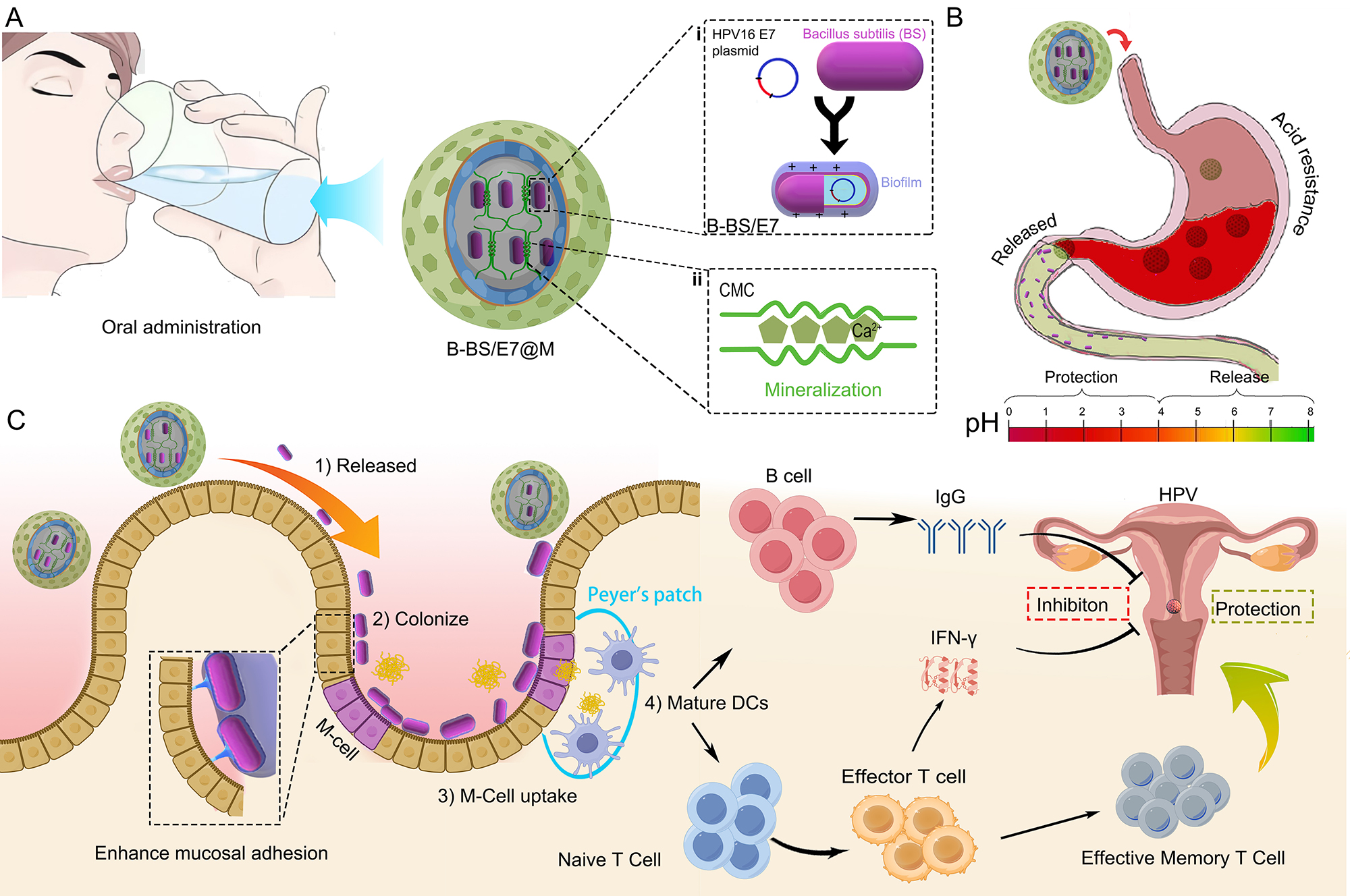 肿瘤疫苗的开发面临两大关键瓶颈:一是如何将抗原安全、有效地递送至免疫系统;二是如何激发强大且持久的免疫应答以同时实现治疗与预防。传统注射疫苗难以有效激活黏膜免疫系统。该研究结合HPV流行病学现状,创新性地将肿瘤抗原递送与肠道这一人体最大的免疫器官相结合,以益生菌枯草芽孢杆菌为载体,对其进行了基因工程改造,使其能够稳定表达HPV16 E7肿瘤抗原。研究还通过矿化工艺,实现以细菌生物被膜包裹的HPV疫苗(B-BS/E7@M)构建。该疫苗能够促进DC细胞分化,精准杀伤肿瘤的细胞;也可促进T淋巴细胞进一步发育成为中央记忆性T细胞,从而在体内建立针对肿瘤的长期免疫监视与保护,实现了“治疗与预防一体”的目标,为发展新一代“无针化”、可编程的肿瘤免疫疗法开辟了全新路径。