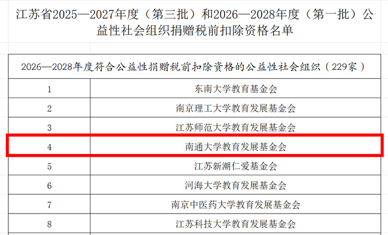 近日,江苏省财政厅、国家税务总局江苏省税务局、江苏省民政厅联合发布《关于江苏省2025—2027年度(第三批)和2026—2028年度(第一批)公益性社会组织捐赠税前扣除资格名单的公告》,我校教育发展基金会获得2026—2028年度公益性捐赠税前扣除资格。