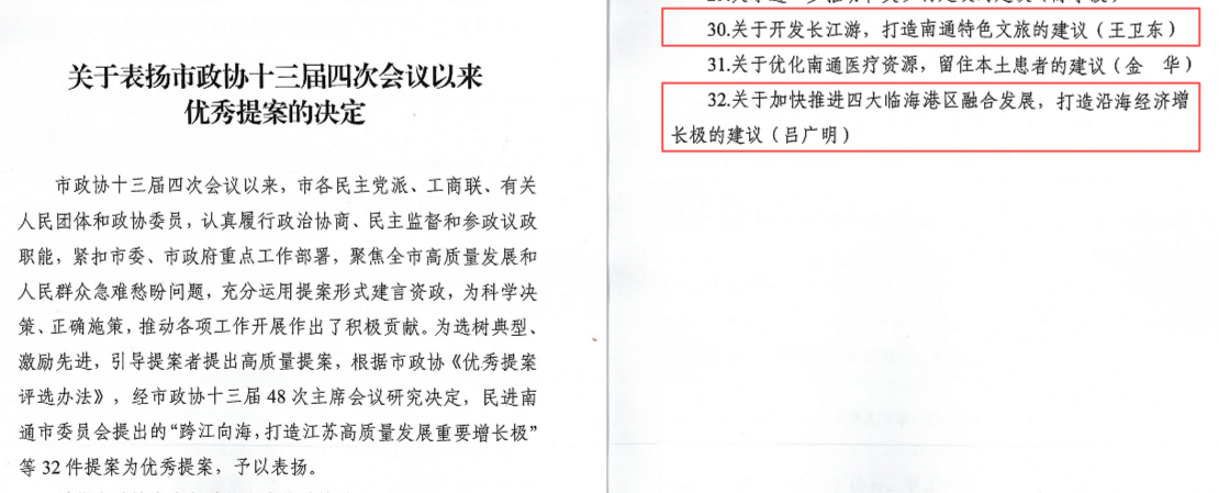 我校各民主党派成员、无党派人士、人大代表和政协委员始终围绕地方经济社会发展的重要议题,深入调研、务实建言,形成了一批具有前瞻性和建设性的参政议政成果。其中,校党委副书记、南通市政协委员王卫东提出的提案《关于开发长江游,打造南通特色文旅的建议》,聚焦长江南通段独特的自然与人文资源,提出通过明确发展定位、深化文化挖掘、水陆统筹发展等一系列举措,深度开发长江游,推动文旅融合,为南通文旅产业发展注入新活力,进一步提升城市文化影响力与知名度。南通市政协常委、民盟南通大学委员会主委吕广明提出的提案《关于加快推进四大临海港区融合发展,打造沿海经济增长极的建议》,围绕南通沿海开发与江海联动战略,从优化港区功能定位、完善区域协调机制、加强人才队伍建设等方面提出对策,助力南通构建高质量发展新格局。