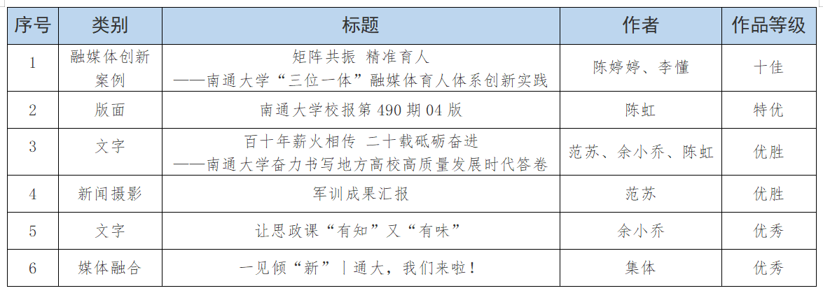 本次江苏高校年度好新闻作品评选分为媒体融合、版面、纪录片、文字作品、新闻摄影五个类别,全省各高校共报送作品313件。我校获奖作品中,《南通大学校报第490期04版》获评版面特优作品,《百十年薪火相传 二十载砥砺奋进——南通大学奋力书写地方高校高质量发展时代答卷》获评文字优胜作品,《军训成果汇报》获评新闻摄影优胜作品,《让思政课“有知”又“有味”》获评文字优秀作品,《一见倾“新”丨通大,我们来啦!》获评媒体融合优秀作品。