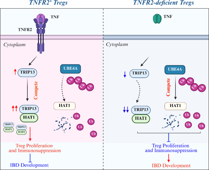 Treg细胞是免疫稳态的核心,TNF-TNFR2 通路可促进其增殖,但机制尚不明。团队发现TRIP13是TNF-TNFR2 介导的 Treg细胞增殖的下游关键分子,该分子通过其ATP 酶活性与 HAT1结合,竞争性抑制 UBE4A 介导的 HAT1 泛素化降解,稳定 HAT1 以促进 Treg细胞增殖和免疫抑制功能,最终缓解结肠炎。TRIP13-HAT1 轴为自身免疫病和炎症性疾病提供了新的治疗靶点。该研究获得了国家自然科学基金的支持。