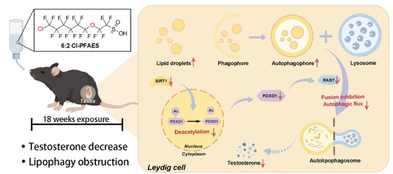 该研究揭示了6:2 Cl-PFAES通过影响脂噬(lipophagy)损伤雄激素合成的分子机制。通过建立的整体和体外6:2 Cl-PFAES暴露模型,发现6:2 Cl-PFAES暴露可抑制SIRT1、FOXO1、RAB7 蛋白表达,从而影响Leydig细胞脂自噬流促进脂滴积累,导致雄激素合成受损。这些发现首次揭示了lipophagy在6:2 Cl-PFAES暴露损伤雄激素合成中的关键作用,为后续6:2 Cl-PFAES暴露损伤雄性生殖的机制研究提供了重要参考,具有重要的科学意义。
