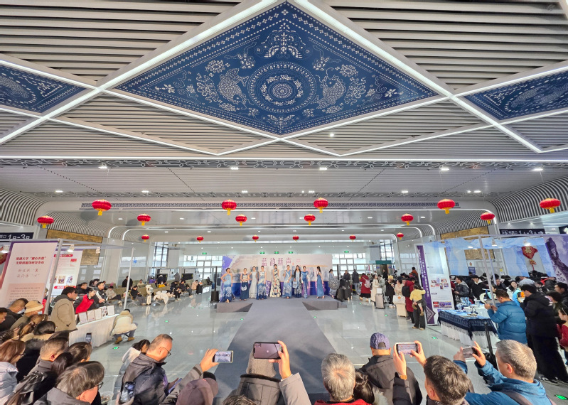 南通西站候车大厅里,一场别开生面的“快闪”吸引了南来北往的旅客驻足观赏。“青出于蓝”非遗新生传创团的成员们身着融入蓝印花布元素的服饰,在候车大厅开展循环快闪走秀,灵动的步伐与独特的服饰风格让候车空间瞬间变身流动的文化舞台。实践团不仅通过图文展示蓝印花布的历史渊源与文化内涵,还指导游客体验非遗技艺,让南通特色文化随列车走向全国各地。