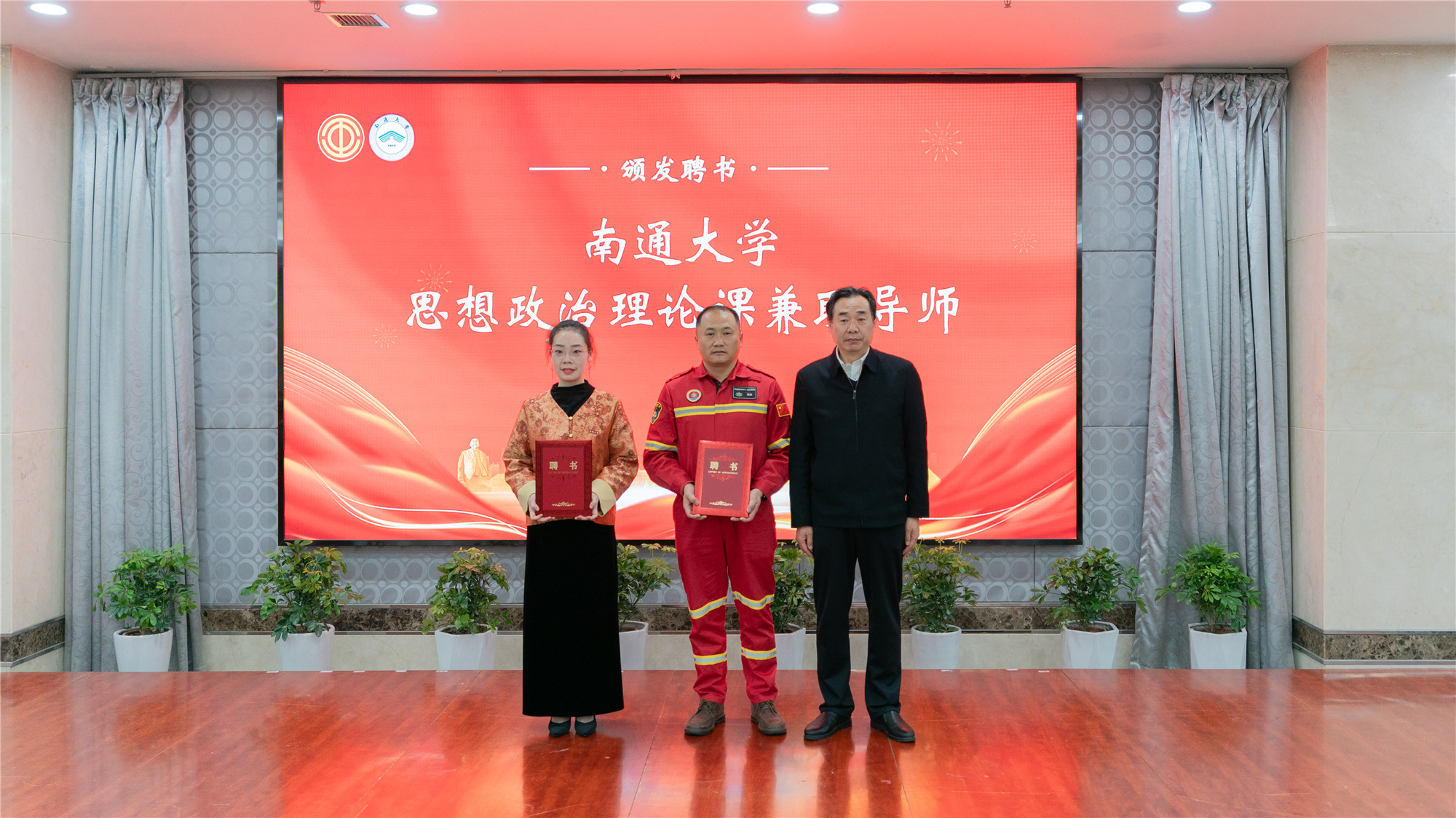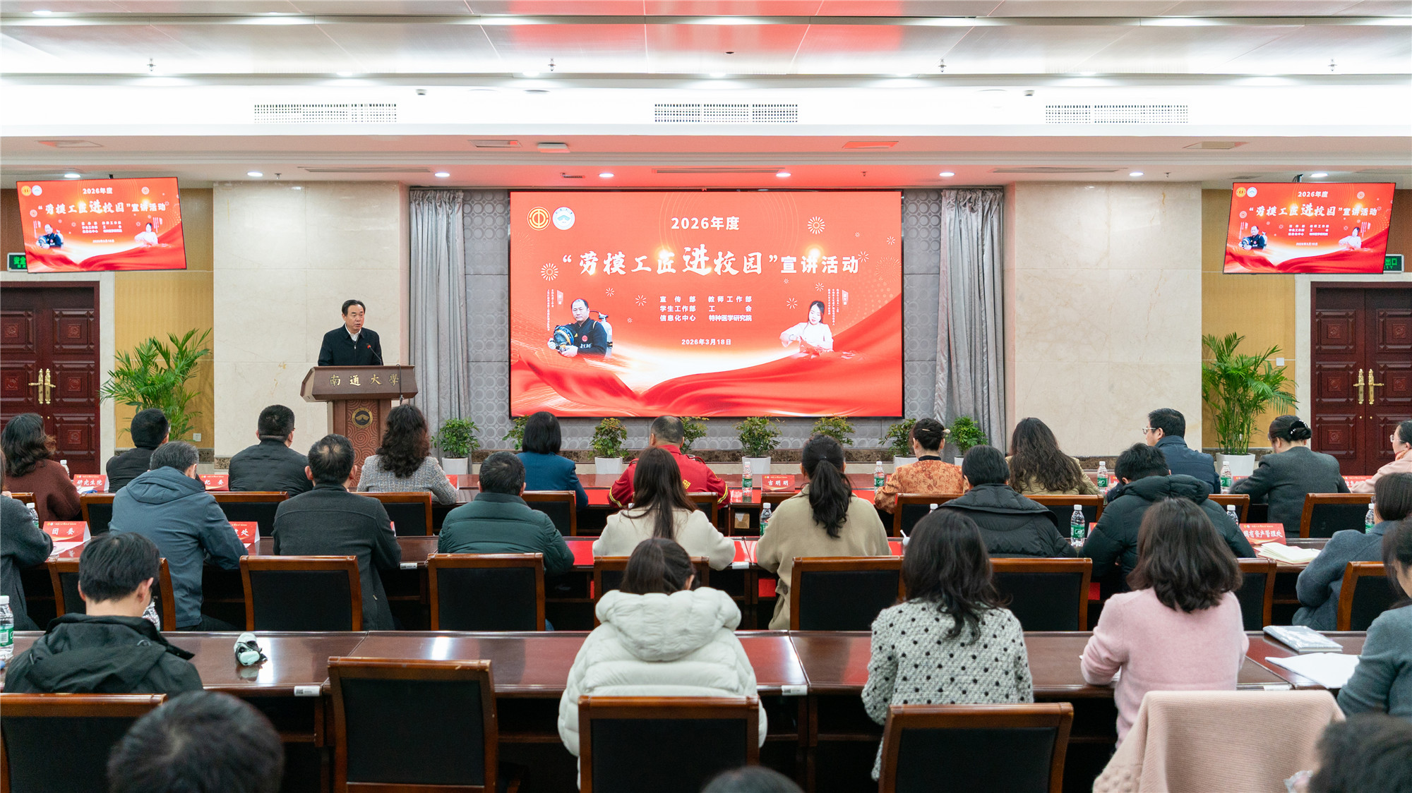 为深入学习贯彻习近平总书记在庆祝中华全国总工会成立100周年暨全国劳动模范和先进工作者表彰大会上的重要讲话精神,3月18日下午,我校举办2026年度“劳模工匠进校园”宣讲活动。校党委常委、副校长吉明明出席活动,并为全国先进工作者、上海打捞局救捞工程船队潜水队队长胡建,南通市江海五一工匠、徐州“翟家大院撕纸”第十八代传承人、我校艺术学院教师翟天麟颁发“南通大学思想政治理论课兼职导师”聘书。