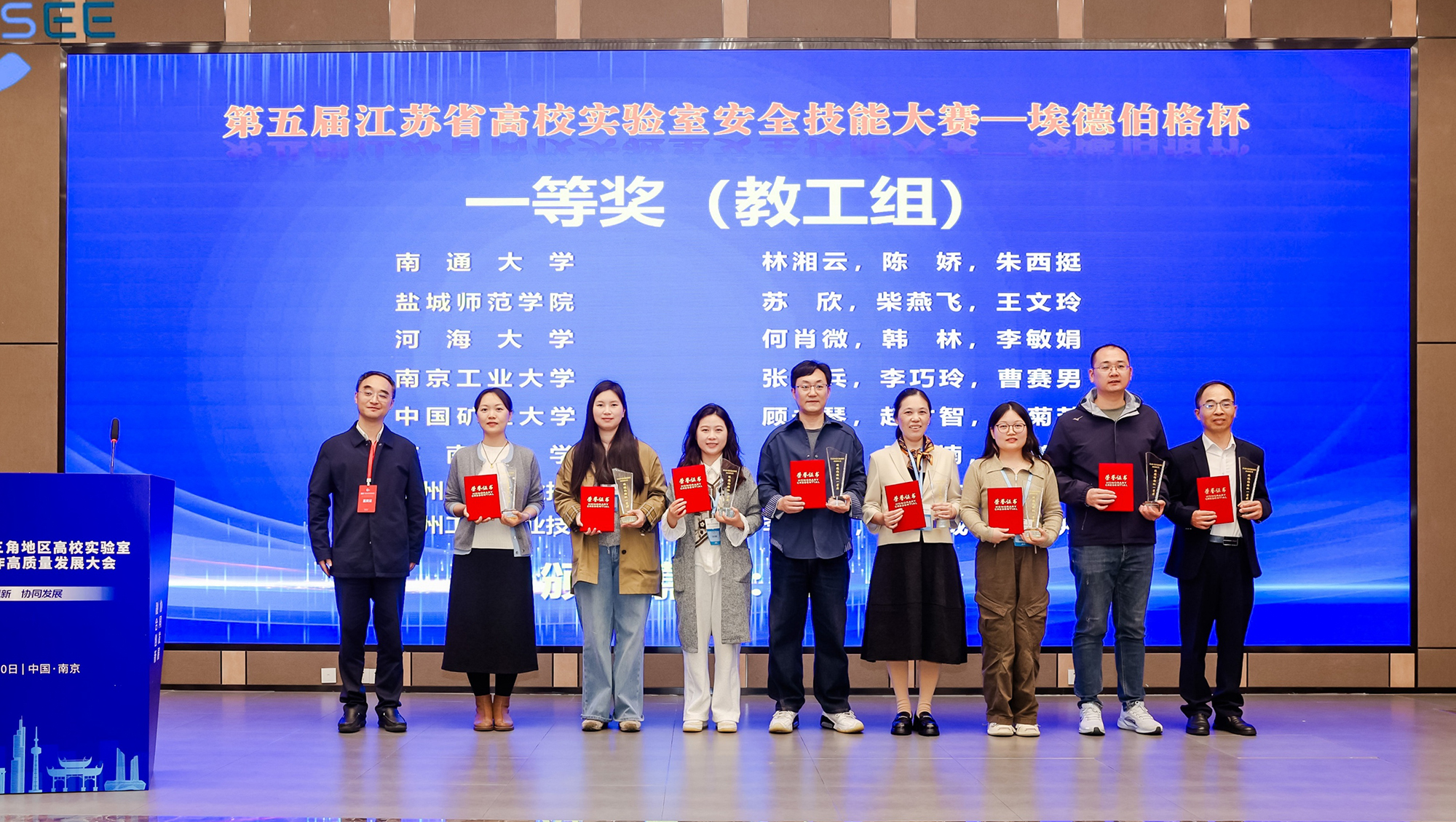 4月9日,2026长三角地区高校实验室工作高质量发展大会召开。会上举办第五届江苏省高校实验室安全技能大赛颁奖典礼,我校代表队表现突出、再创佳绩,其中公共卫生学院林湘云和化学化工学院陈娇、朱西挺组成的代表队获教工组一等奖,纺织服装学院王刚和药学院柏宁婧、蔡沁妍组成的代表队获学生组一等奖。同时,我校作为大赛承办单位,凭借周密组织、优质服务和高效保障,荣获大赛最佳组织奖。