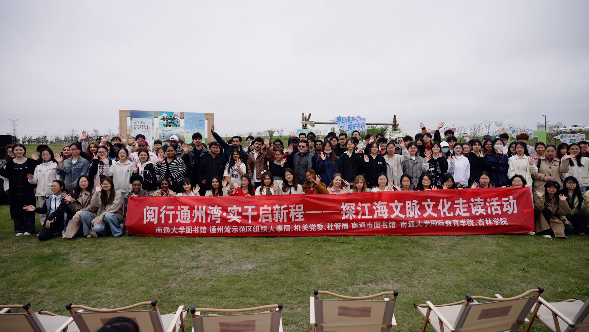 活动启动仪式在我校图书馆举行。图书馆馆长徐毅宣布活动启动,图书馆党总支书记姜衍与南通市图书馆党总支书记、馆长季丰吉在仪式上致辞。本次活动设置了三大沉浸式体验环节,打破了书本与现实的围墙,实现了“读万卷书”与“行万里路”的深度融合。一是巴士课堂,溯源历史。 南通历史文化学者黄正平将车厢变为讲堂,生动讲述《百年南通与10位中外文化名人》,让参与者在移动中领略城市文脉。二是实景品读,致敬先贤。 在江谦耕读处,南通地方文化学者黄为人追溯了近代实业家、教育家江谦“耕读传家、实干兴邦”的生平事迹,引领中外学子实地感悟百年前的家国情怀与教育初心。三是蓝湾书市,阅野共生。 全体人员融入通州湾“蓝湾书市·春日阅野”2026年全民阅读系列活动,共同聆听《超级语文课》全国总冠军、作家马玉炜带来的“草地上的文学课”。30余名我校国际教育学院留学生与参会人员开展文艺交流。