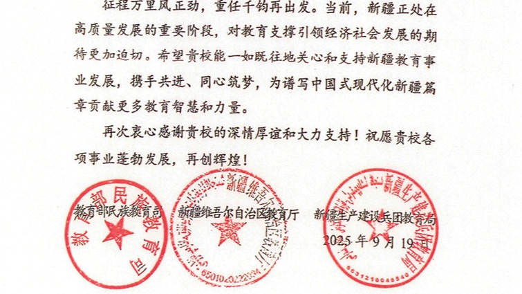 近日,在新疆维吾尔自治区成立70周年之际,教育部民族教育司、新疆维吾尔自治区教育厅、新疆生产建设兵团教育局联合向我校发来感谢信,感谢我校长期以来对新疆教育事业发展的援助和支持。我校深入贯彻习近平总书记关于新疆工作的重要讲话重要指示批示精神,坚决落实全国教育大会及第九次、第十次全国对口支援新疆工作会议部...