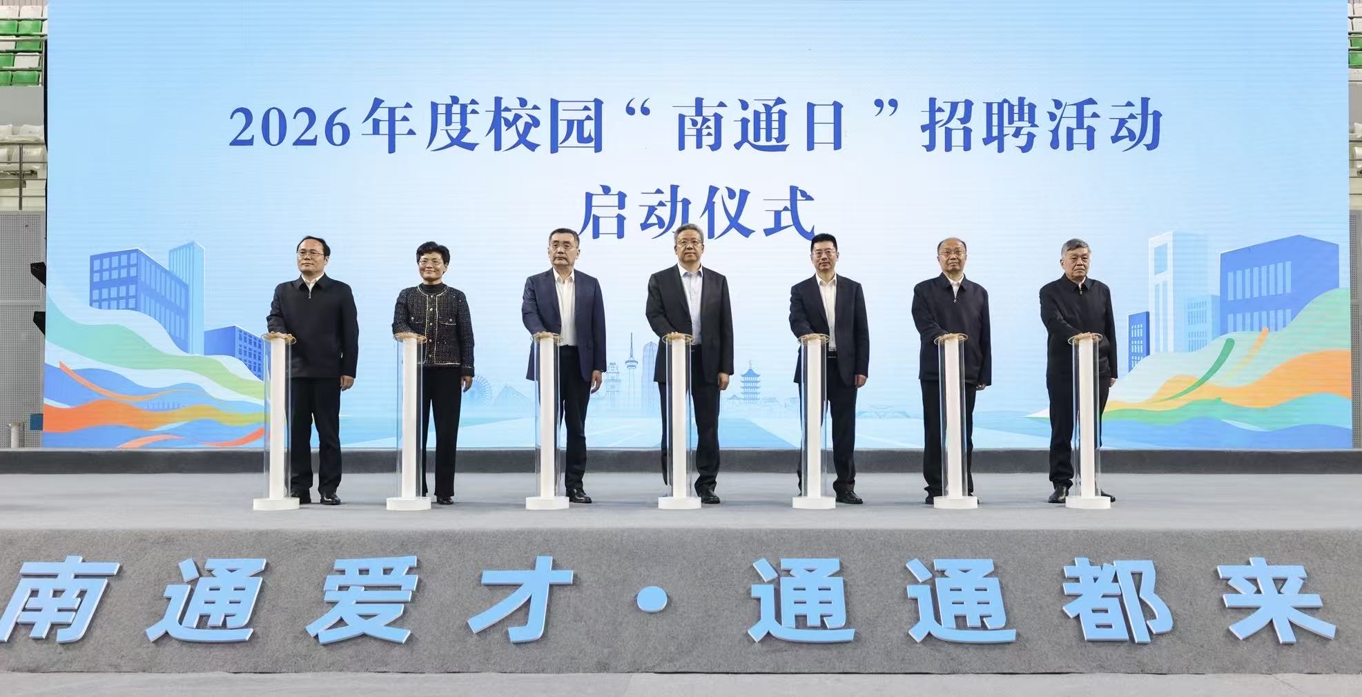 4月20日,“聚江海 赢未来”南通青年人才专场活动在我校举办。南通市委书记吴新明,南通市委常委、组织部部长倪春青,南通市委常委、市政府副市长、党组成员凌屹,我校党委书记杨宇民,江苏工程职业技术学院党委书记钱锁梅,江苏航运职业技术学院党委书记薛扬,江苏商贸职业学院党委书记陈祖华共同按下活动启动键。校党委常...